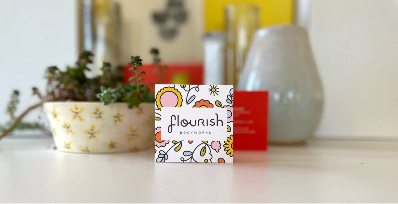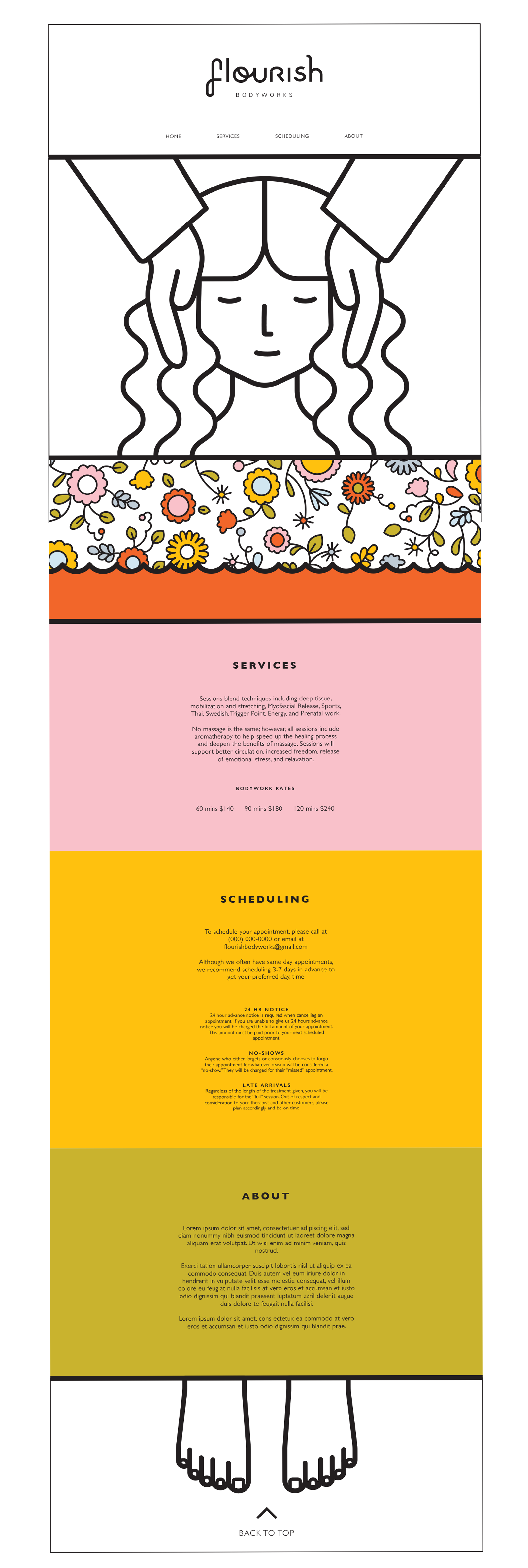 Flourish Bodyworks is the identity of an independent massage therapist. Her wordmark, graphics and color palette aim to represent three pillars of her practice: closeness, renewal and warmth.