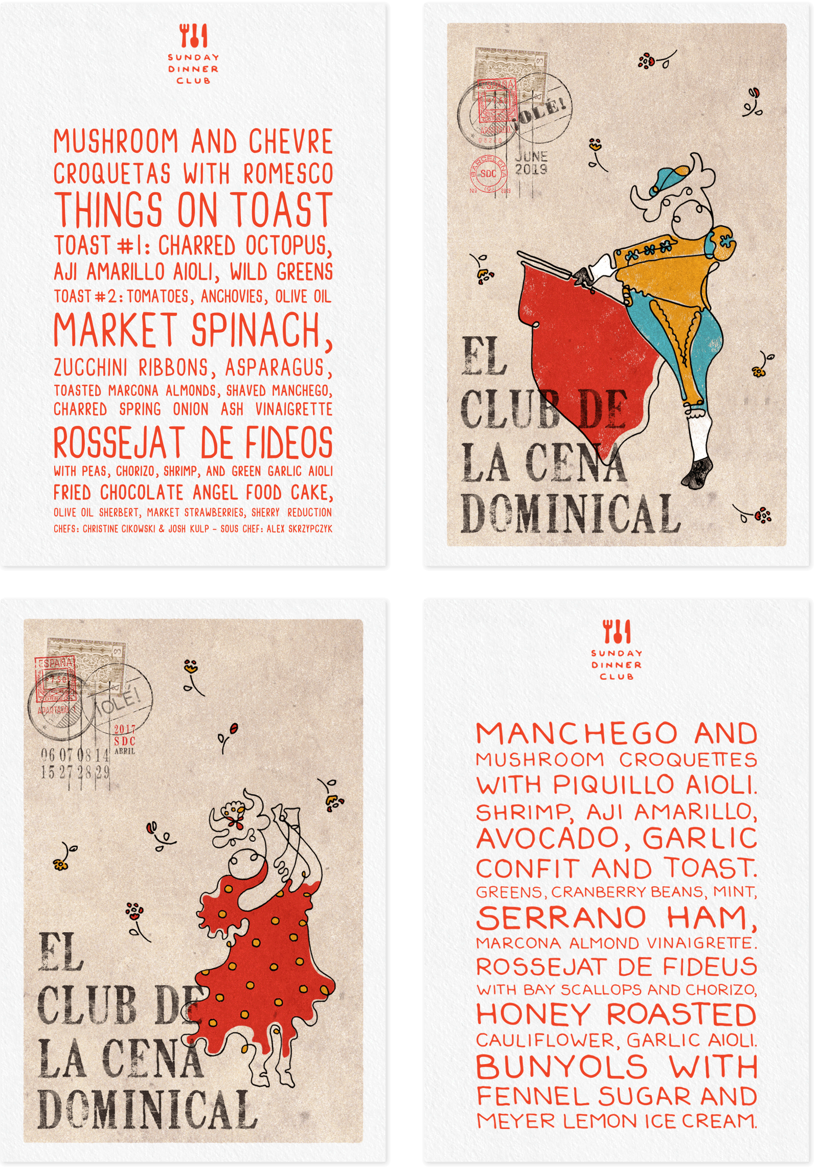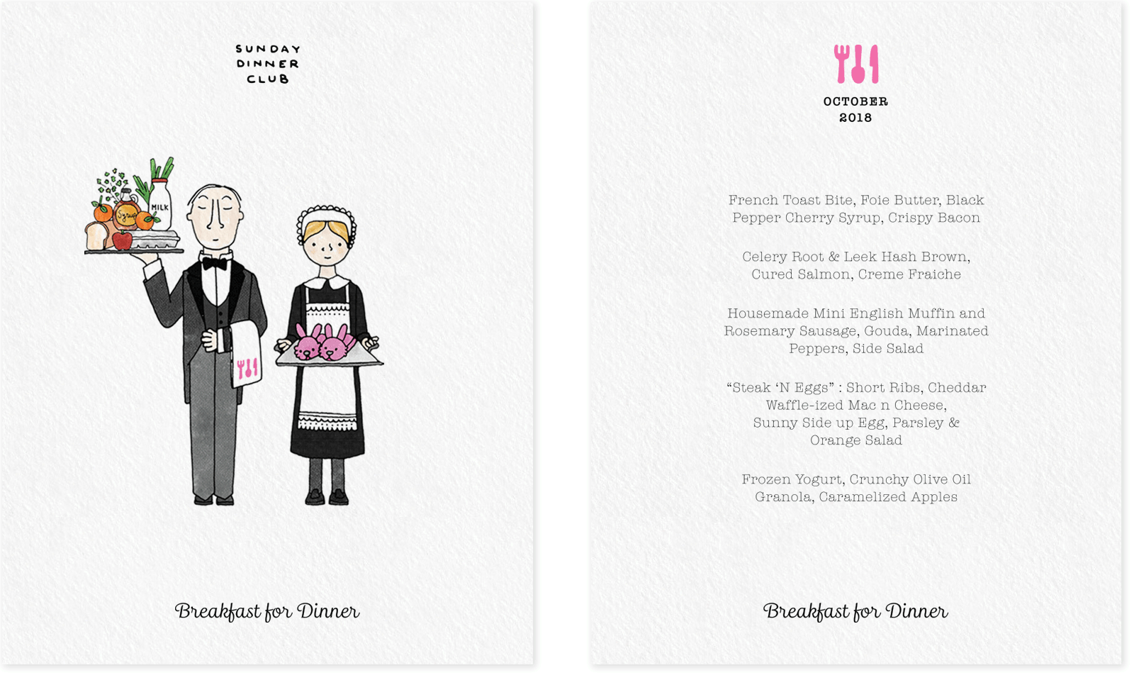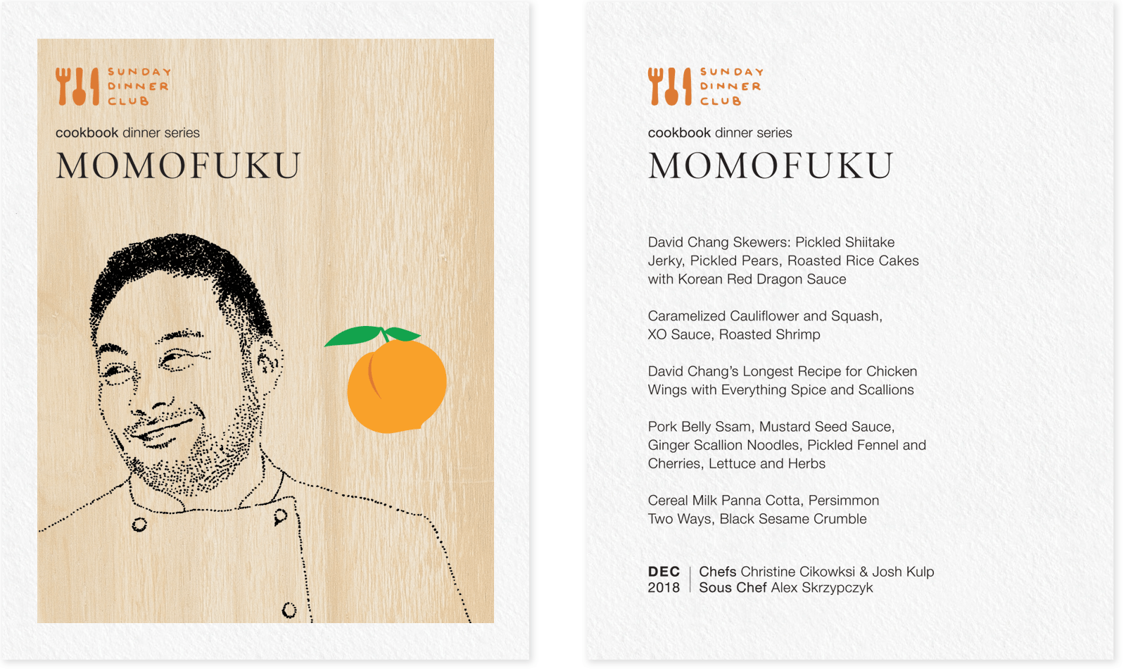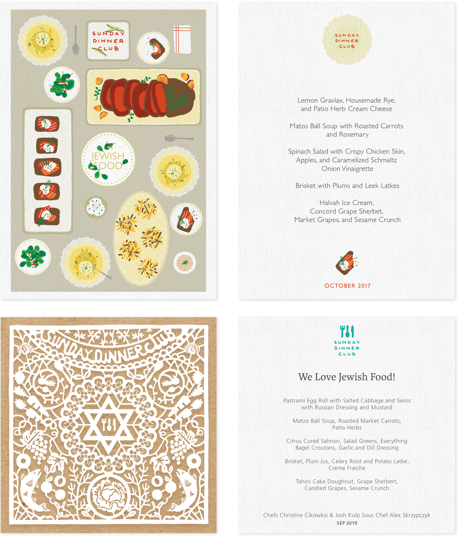 Sunday Dinner Club is a supper club that features monthly rotating menus with themes that vary widely, from cuisine inspired by different countries to dishes based on the works of renowned chefs. Below are some examples of their menus.