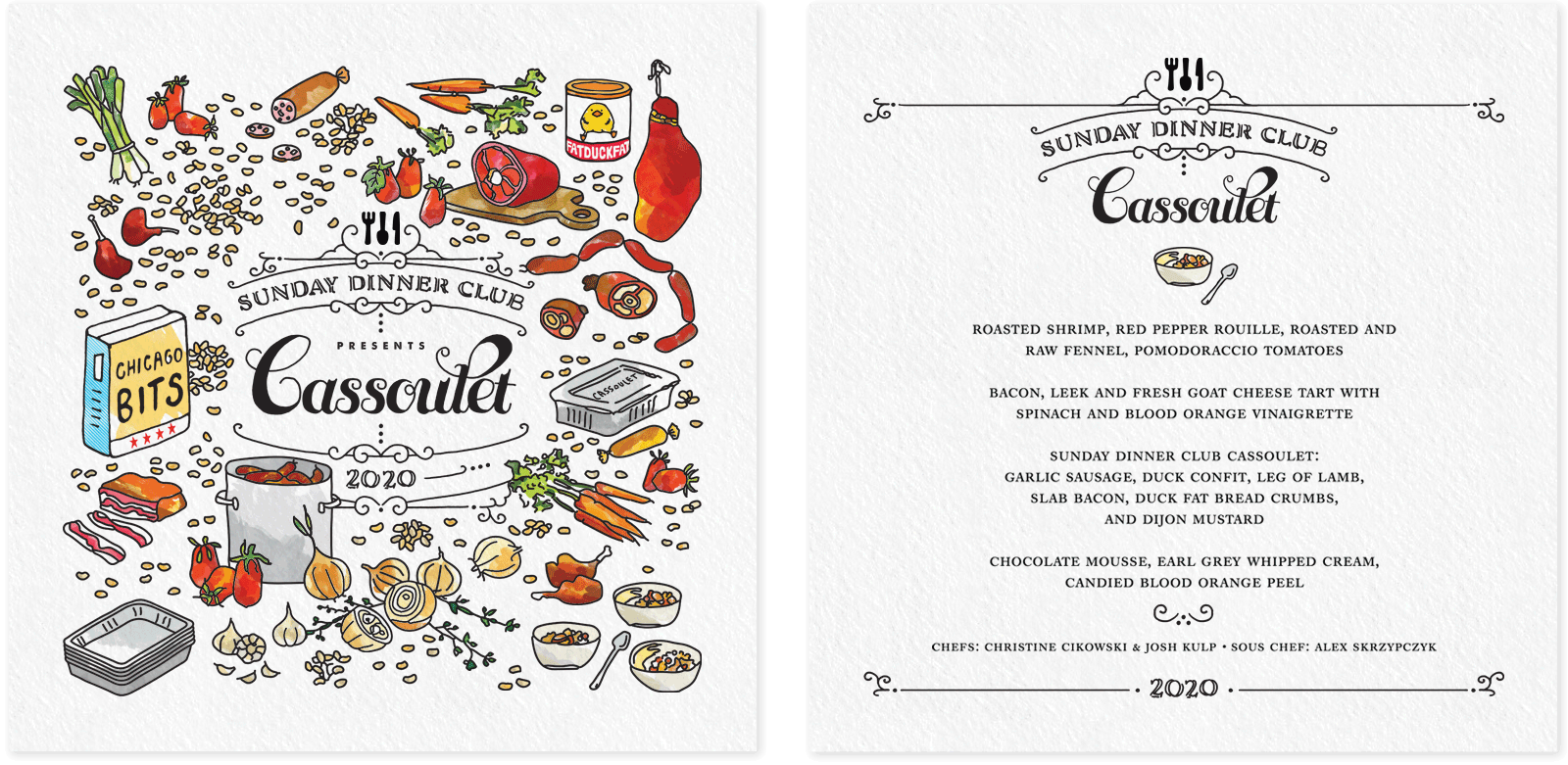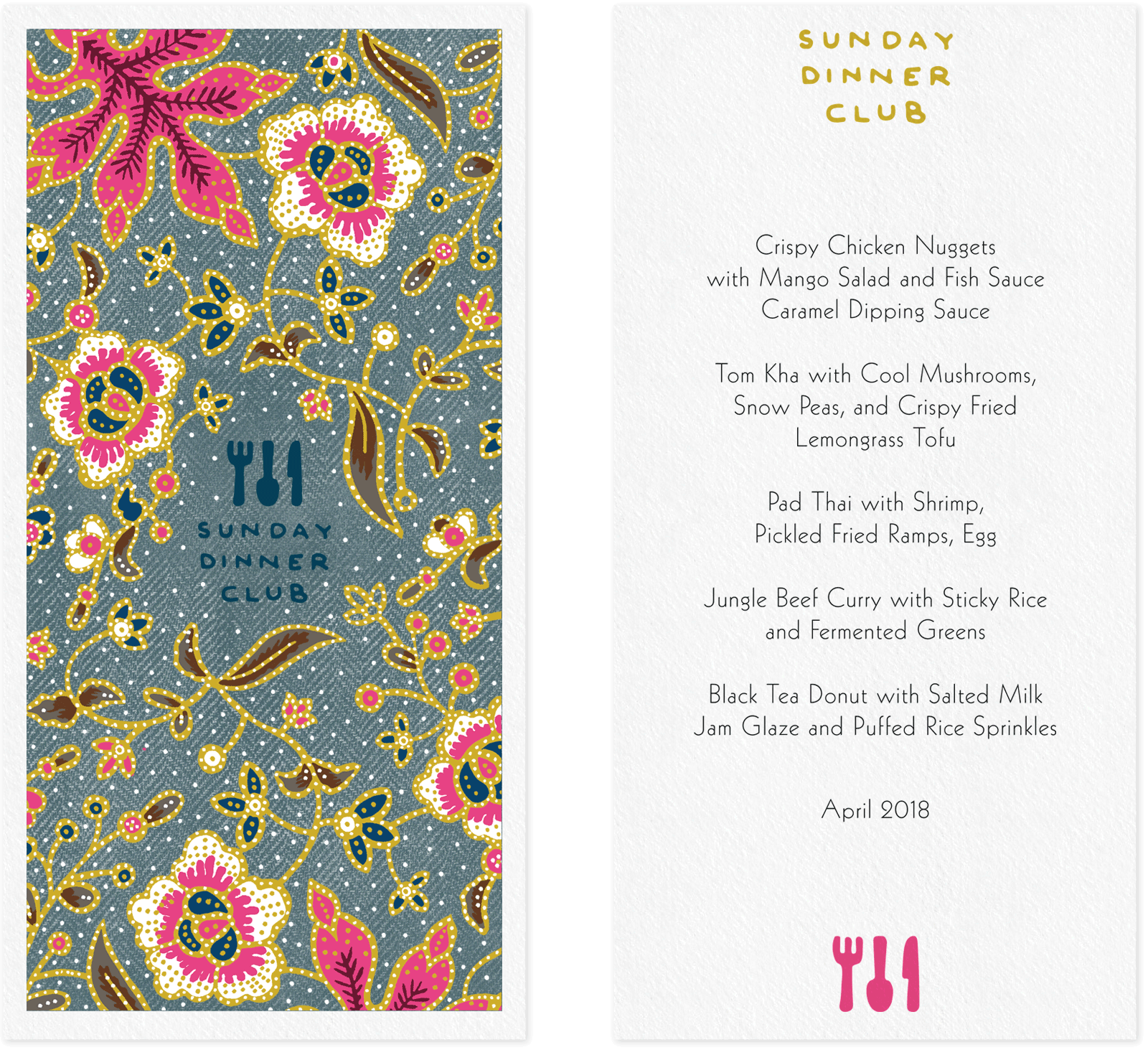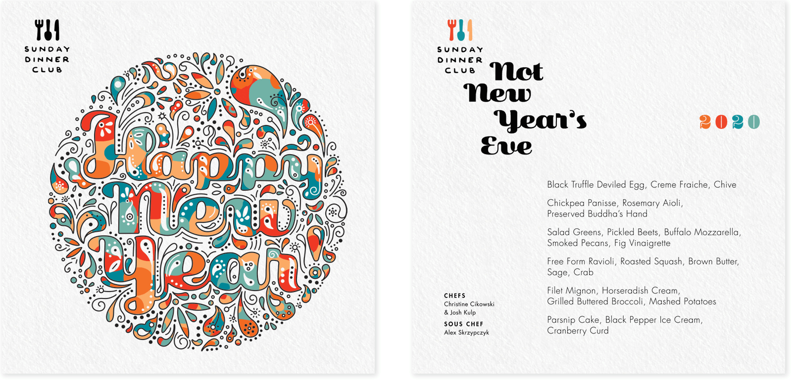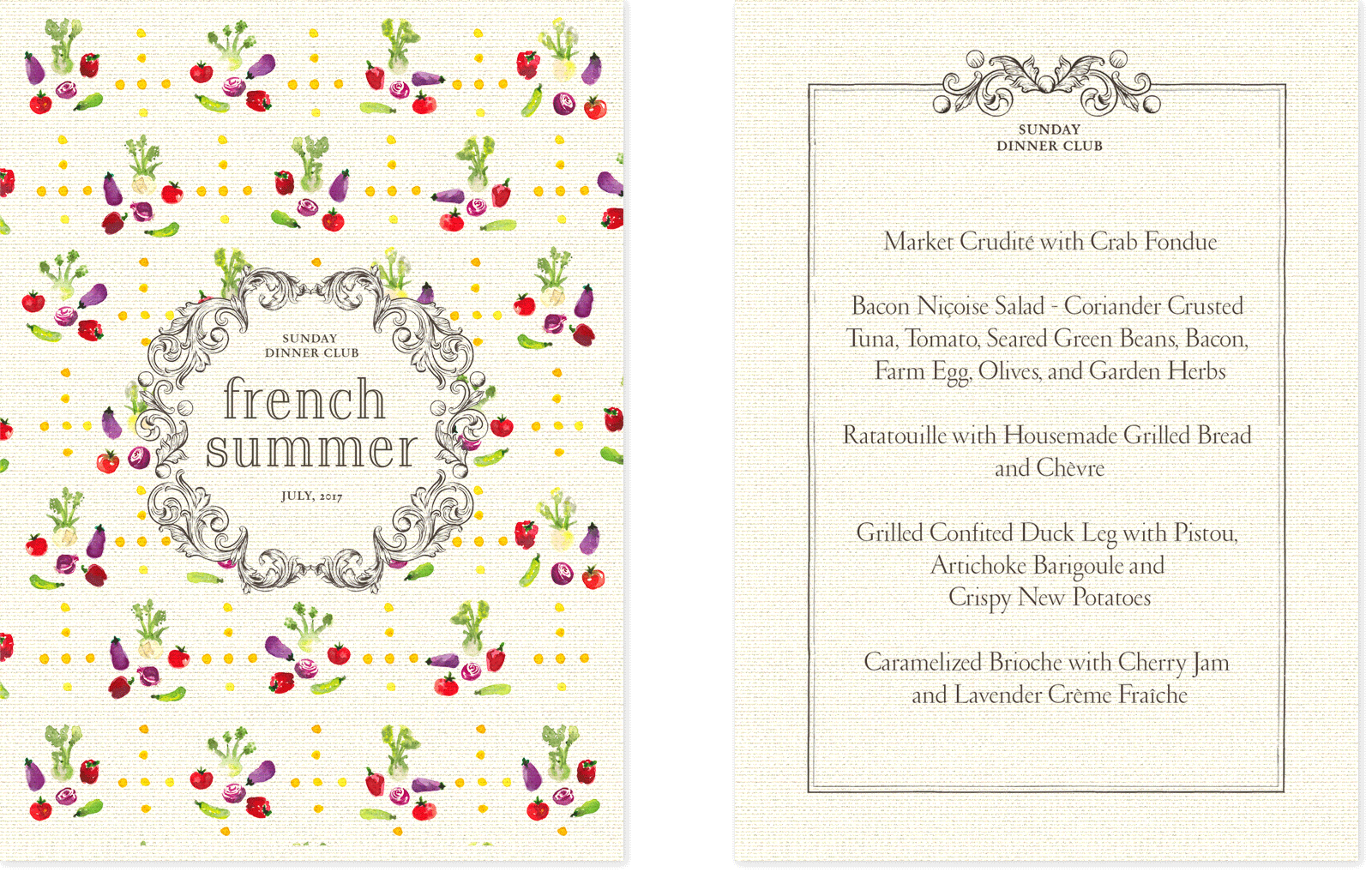 Sunday Dinner Club is a supper club that features monthly rotating menus with themes that vary widely, from cuisine inspired by different countries to dishes based on the works of renowned chefs. Below are some examples of their menus.