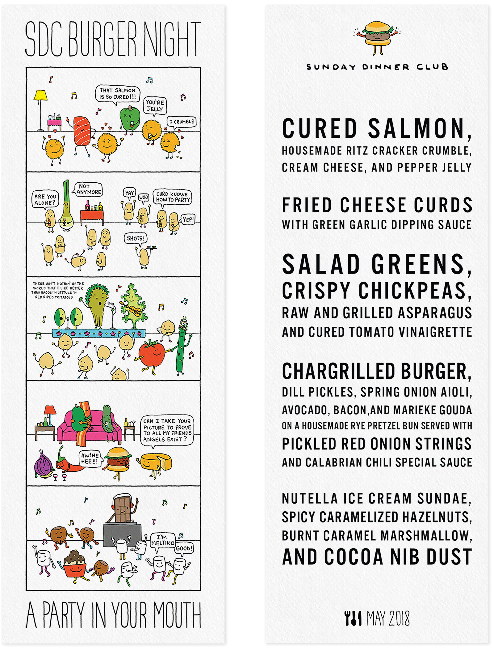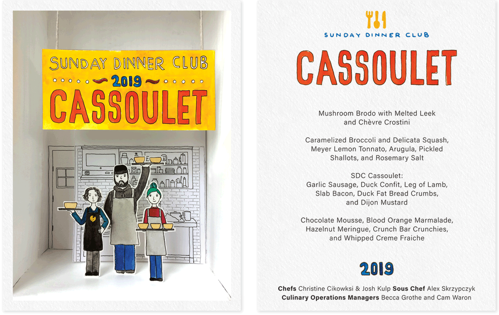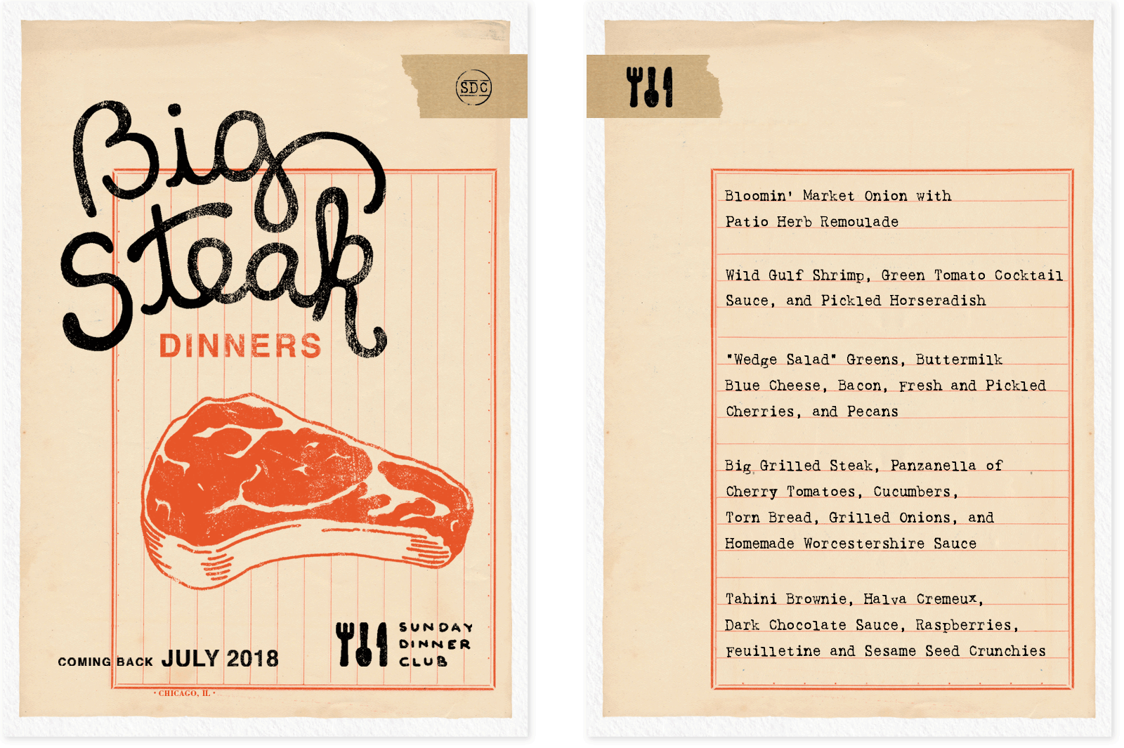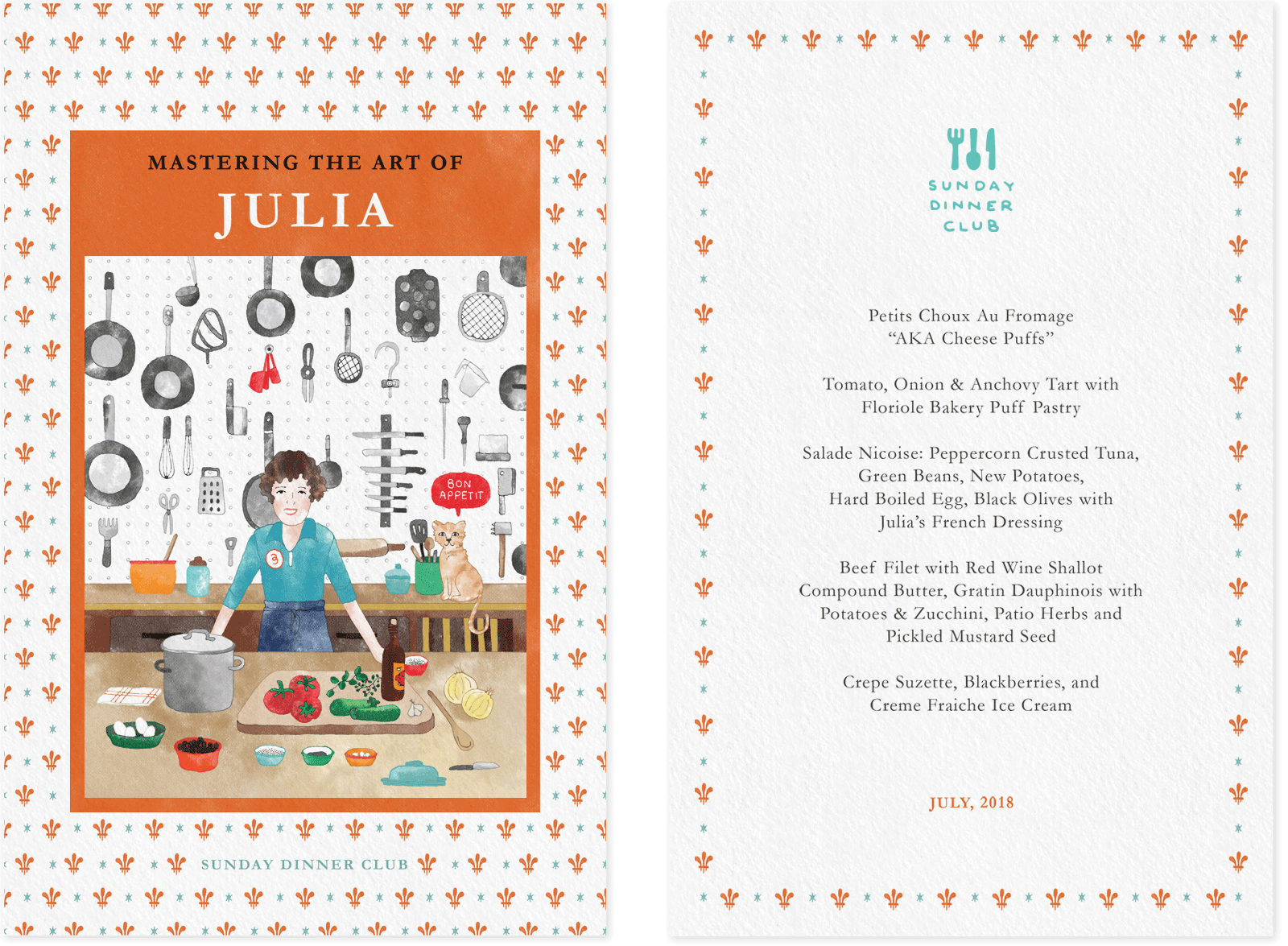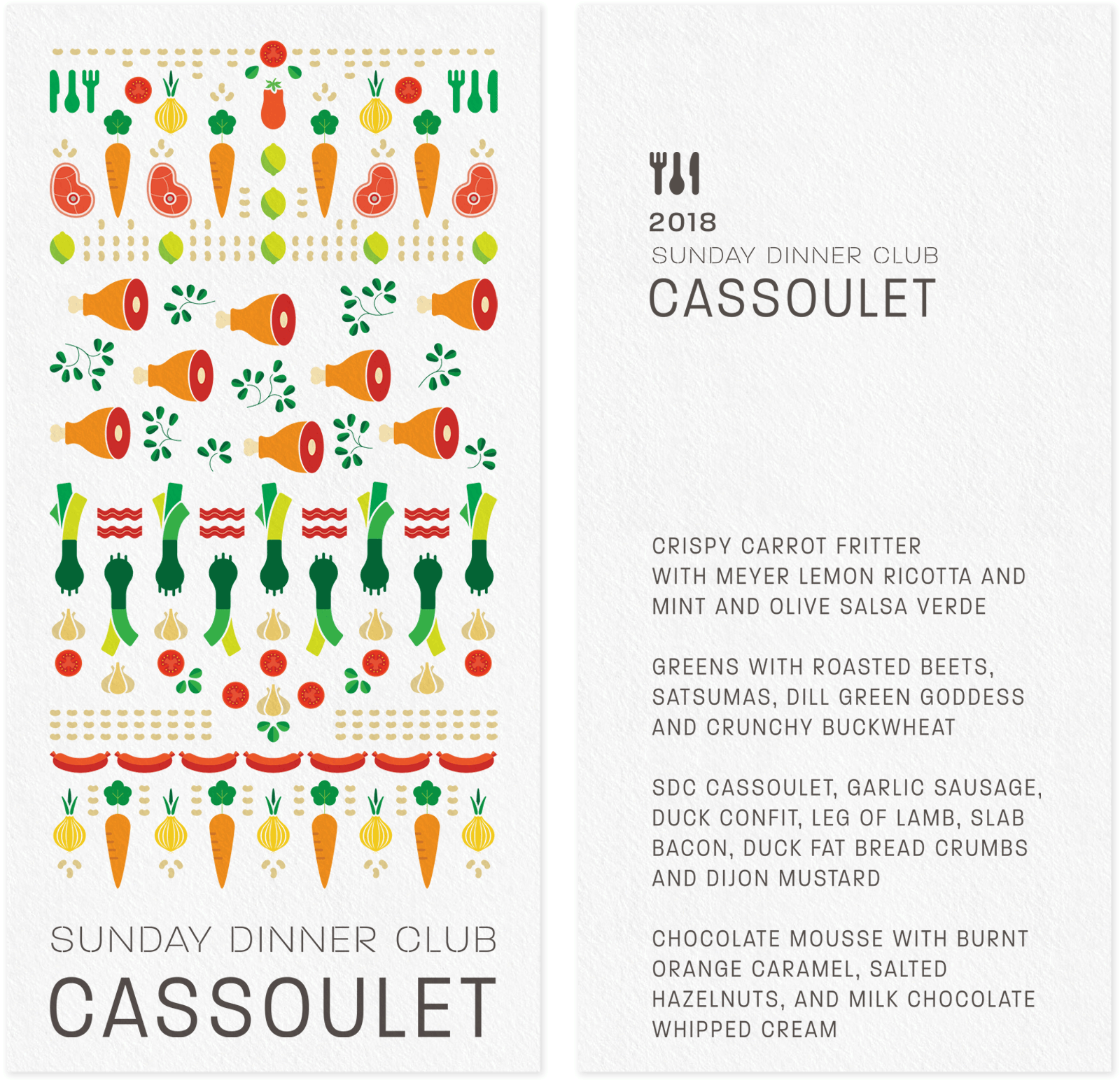 Sunday Dinner Club is a supper club that features monthly rotating menus with themes that vary widely, from cuisine inspired by different countries to dishes based on the works of renowned chefs. Below are some examples of their menus.